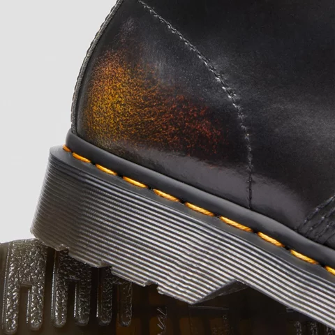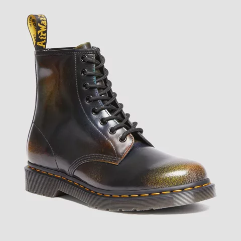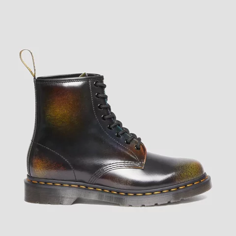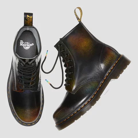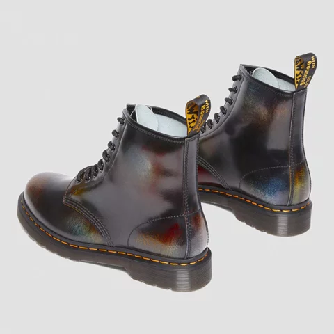 Rainbow Rub-Off ist ein hochglänzendes Leder mit einer regenbogenfarbenen Grundfarbe und einer kontrastierenden schwarzen Deckschicht, die sich mit der Zeit abreiben lässt und die darunter liegenden Farben zum Vorschein bringt. Pflege mit Dr. Martens Shoe Polish in neutraler oder farbiger Ausführung